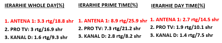Și în Prime Time, Antena 1 s-a impus ca lider de audiență la nivelul publicului comercial, cu 8.9 puncte de rating cu 25.9% cota de piață, Pro Tv fiind pe locul 2, cu 7.3 puncte de rating și 21.2% cota de piață.