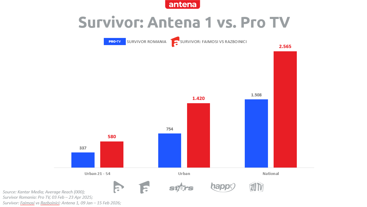 Survivor e lider de audiență la Antena 1! Cel mai dur format de televiziune a fost din nou lider de audiență în weekend, iar întreg sezonul este urmărit cu interes ridicat. Media audienței din acest sezon este mult mai mare față de media difuzării sezonului trecut, pe toate categoriile de public.