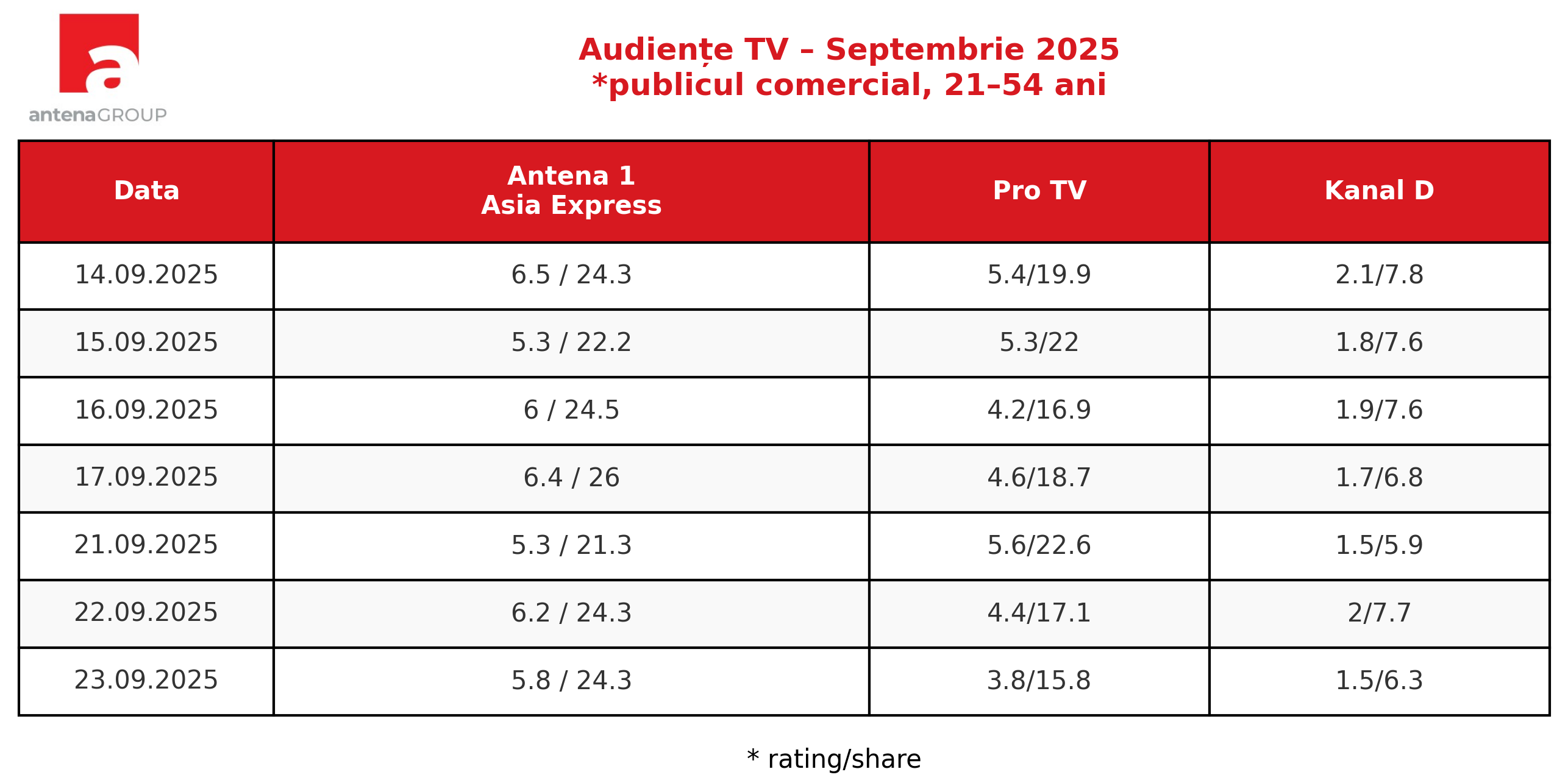 După ce a dominat audienţele verii cu Insula Iubirii, Antena 1 rămâne lider în Prime Time și în această toamnă cu show-ul preferat al românilor: Asia Express – Drumul Eroilor.