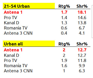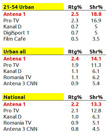 Ierarhia s-a păstrat și pe tronsonul publicului urban, Chefi la cuțite înregistrând 5.6 puncte de rating și 17.7% cotă de piață, în timp ce postul de pe locul 2, Pro TV, a obținut 4 puncte de rating și 12.5% cotă de piață.