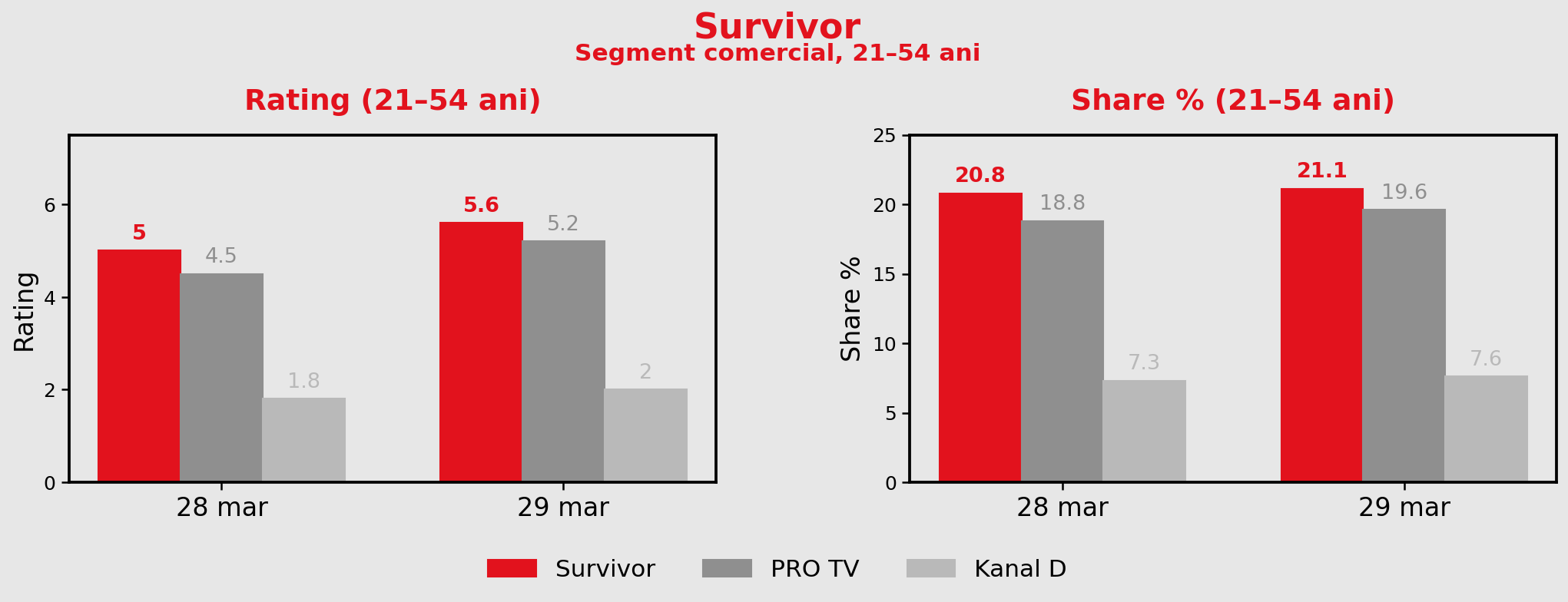 La nivelul publicului comercial cu vârste cuprinse între 21 și 54 de ani, serialul a obținut o audiență medie de 3.8 puncte de rating și 18.6% cotă de piață şi a fost urmat de programul oferit de Pro TV, care în acelasi interval şi la nivelul aceluiaşi target înregistra 2.5 puncte de rating şi 12.4% cota de piață.