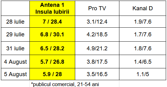 Românii se adună cu milioanele în faţa televizoarelor la cel mai fierbinte show de vară, Insula Iubirii. Toate ediţiile de până acum au fost lider de audienţă la Antena 1 la diferenţă mare faţă de principalii competitori.