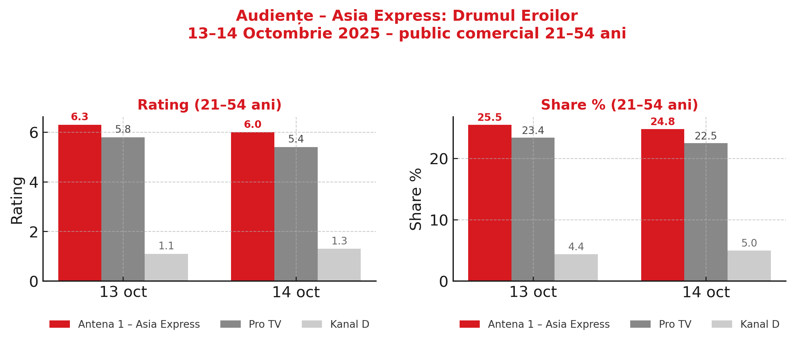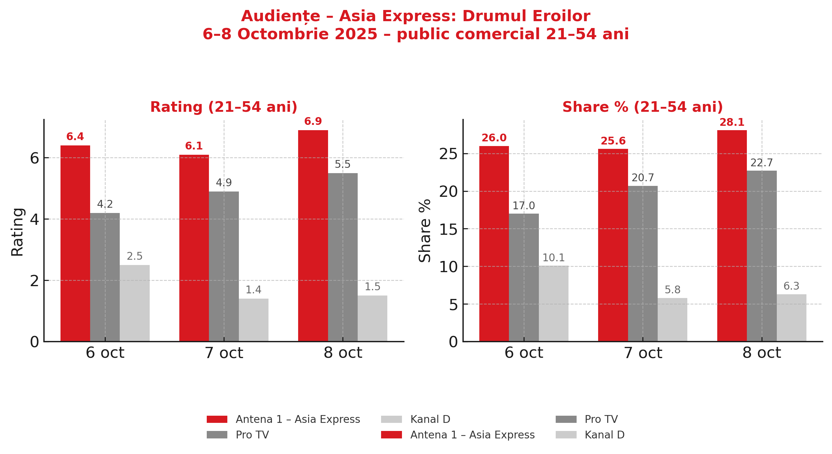 Cel mai dur reality show continuă pe Drumul Eroilor cu noi aventuri memorabile atât pentru participanţi cât şi pentru cei de acasă. Fiecare ediţie Asia Express este lider de audienţă în luna octombrie, aşa cum s-a întâmplat şi în luna septembrie, pe segmentul comercia, 21-54 de ani.