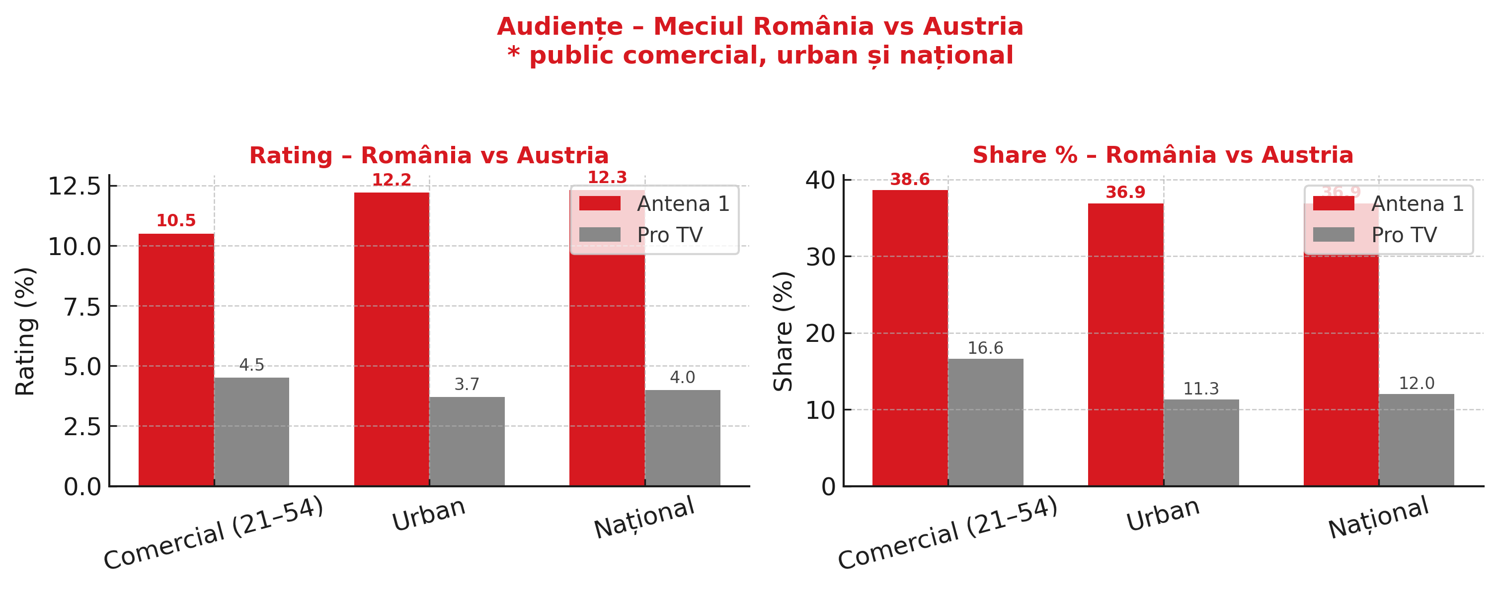 În minutul de aur, 22:13, confruntarea România - Austria a fost urmărită de peste 2.3 milioane de telespectatori.