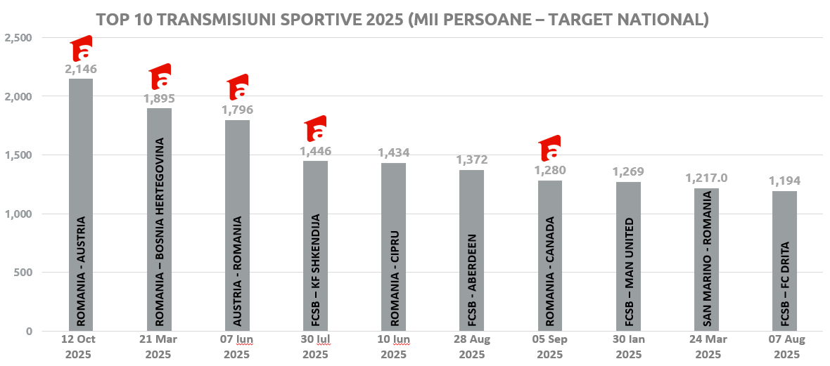 Cu 2.146 milioane de telespectatori, meciul de fotbal România este şi programul cu cea mai mare audienţă la nivel naţional în anul 2025.