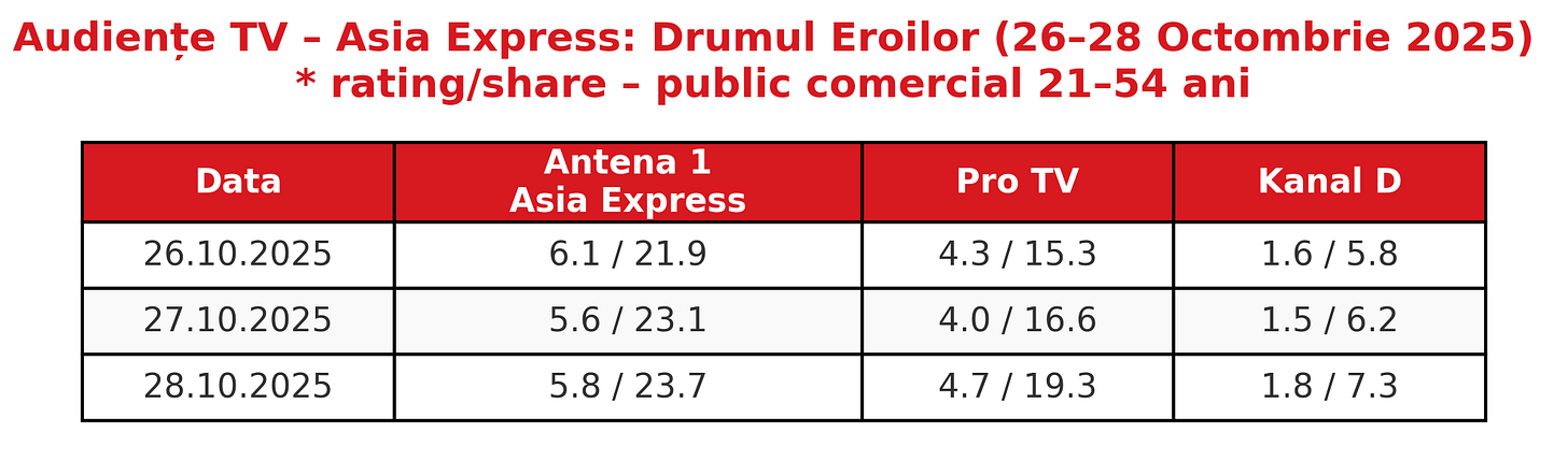 Asia Express - Drumul Eroilor propune un nou sezon plin de imprevizibil şi de situaţii spectaculoase pentru echipele implicate în cel mai dur reality show din România. Săptămâna aceasta, primele echipe au câştigat biletul către Coreea de Sud, locul unde va avea loc marea finală de anul acesta. Toate ediţiile au fost ca de obicei lider de audienţă pe segmentul comercial cu vârste cuprinse între 21 şi 54 de ani.