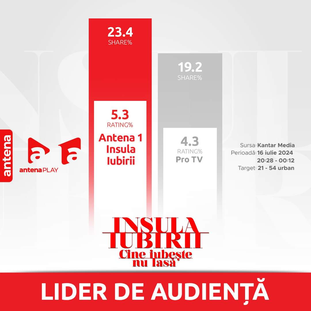 Un nou sezon din cel mai fierbinte show de televiziune - Insula Iubirii, a debutat în forță cu sezonul 8 la Antena 1. Românii au urmărit în număr foarte mare cea de-a doua ediţie a celui mai dur test de fidelitate, aceasta impunându-se ca lider de audienţă, atât la nivelul publicului comercial, cu vârste cuprinse între 21 şi 54 de ani, cât şi la nivel urban. Astfel, la nivelul publicului comercial cu vârste cuprinse între 21 şi 54 de ani, Antena 1 a înregistrat 5.3 puncte de rating şi 23.4% cotă de piaţă, urmată de Pro Tv cu 4.3 puncte de rating şi 19.2% cota de piaţă. Ierarhia se păstrează şi la nivelul publicului din mediul urban.